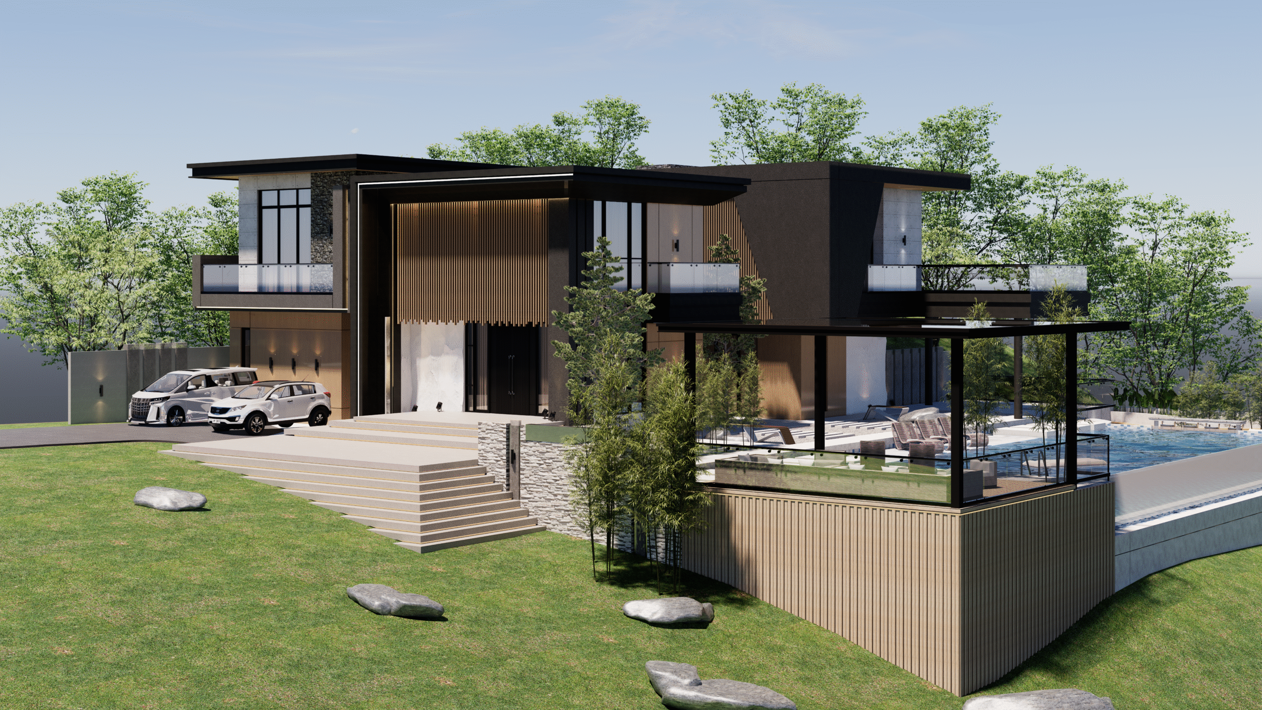 Proyek ini merupakan perwujudan arsitektur resort modern yang menggabungkan desain kontemporer mewah dengan nuansa tropis alami. Bangunan utama tampil megah dengan garis-garis tegas dan material eksklusif, dipadukan dengan elemen kayu vertikal serta kaca berukuran besar yang menghadirkan kesan elegan sekaligus hangat.